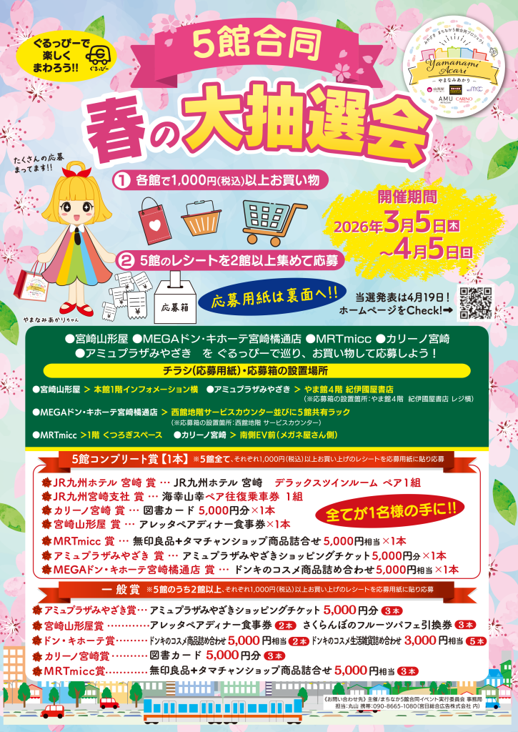 宮崎山形屋、MRTmicc、アミュプラザみやざき、カリーノ宮崎、MEGAドン・キホーテ宮崎橘通店の5館が合同で、豪華賞品が当たる、「5館合同春の大抽選会」を実施いたします。